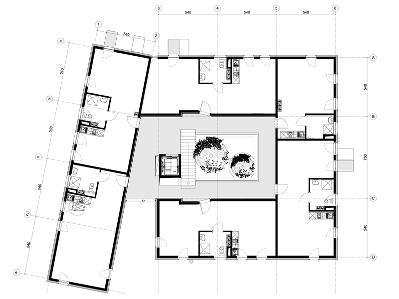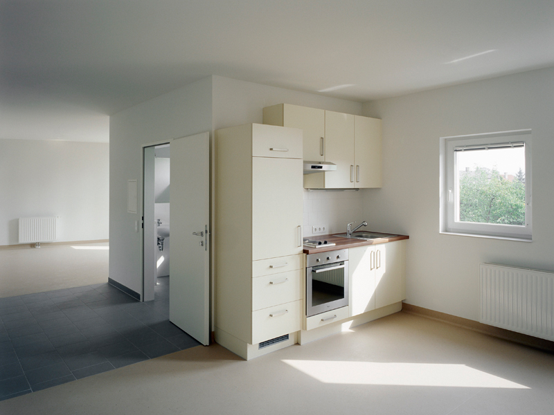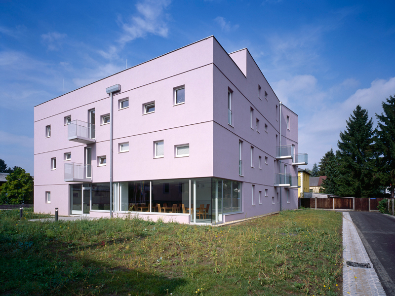 Betreuungsformen im Wohnen können je nach Intensität der Betreuung unterschiedlich organisiert sein. Die einfachste Form stellt so genanntes Betreubares Wohnen dar. Im Betreubaren Wohnen Spillern werden 16 kleine Wohneinheiten durch einen Gemeinschaftsraum, eine Gemeinschaftsküche, ein Gemeinschaftsdachgarten sowie durch eine Anlaufstelle für eine Betreuungsorganisation ergänzt. Der Baukörper orientiert sich als Atriumtyp an bestehenden historischen Bauformen vor Ort und interpretiert diese neu. Er besteht aus zwei Elementen - einem U - förmigen überdachten Hofgebäude und einem linearen, leicht aus der Achse gekippten Bauteil. Das Atrium wird als halböffentlicher, geschlossener Platz und erweiterte Wohnfläche verstanden, so wie auch die umlaufenden Gänge. Sie dienen neben der Erschließung als Kommunikationszone und Vorplatz vor der Wohnung, analog zur Bank vor dem eigenen Haus. Die für alle Bewohnenden zugängliche Dachterrasse mit einem Kräuter-Therapiegarten bildet einen zusätzlichen Anziehungspunkt. 16 Wohnungen zu je ca. 50m2 sind offen strukturiert: Ein mittiges, barrierefreies Bad mit natürlicher Belichtung teilt den Raum in zwei Bereiche, einen Wohn-, Koch- und Essbereich und einen Schlafbereich. Jede Wohnung erhält ein zusätzliches Fenster in den Innenhof, der mit unterschiedlichen Zement- gebundenen Platten in Beige- und Grautönen verkleidet ist. Baukörper, Struktur und Atmosphären sollen die Kommunikation und das Gemeinschaftsleben fördern.